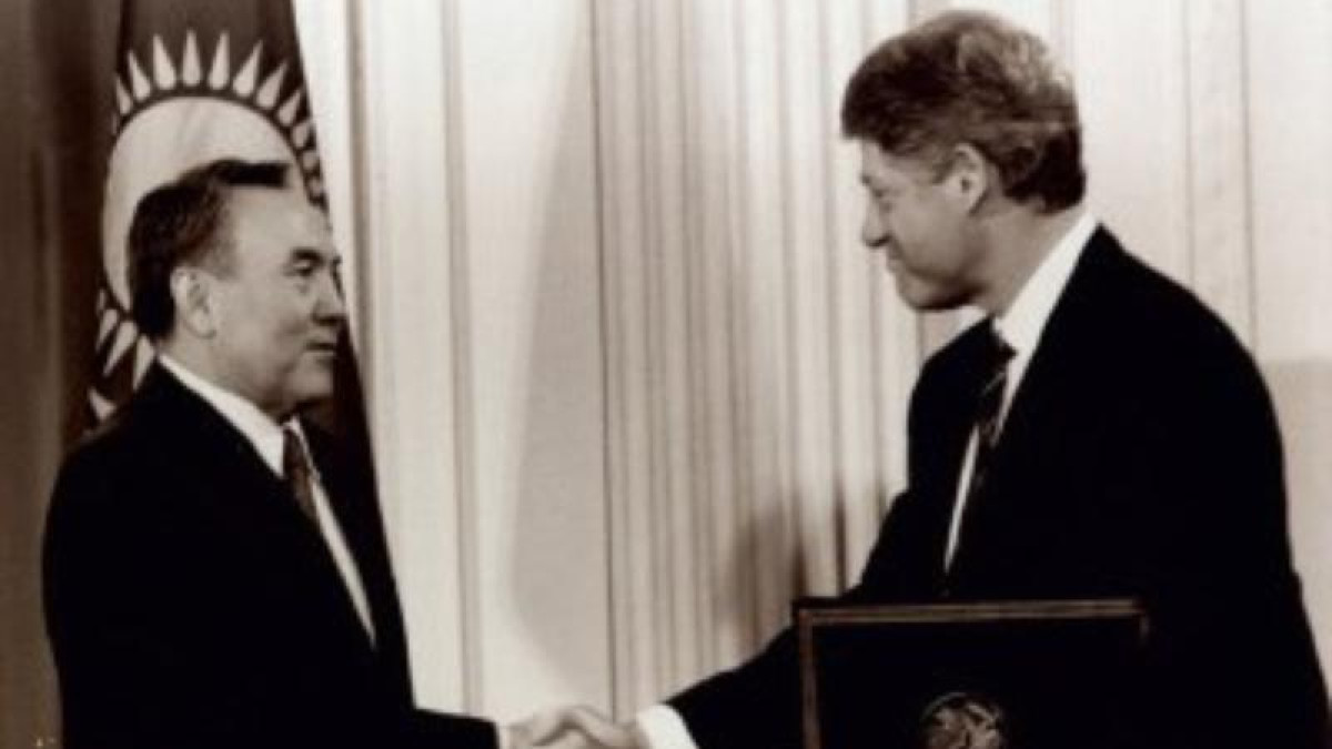 Фотосуретте Қазақстан Президенті Нұрсұлтан Назарбаев АҚШ-қа сапары барысында, Шарттың депозитарийлерінің бірі ретінде АҚШ Президенті Билл Клинтонға Ядролық қаруды таратпау туралы шартқа қосылу бойынша ратификациялау құжаттының көшірмесін ұсынуда.