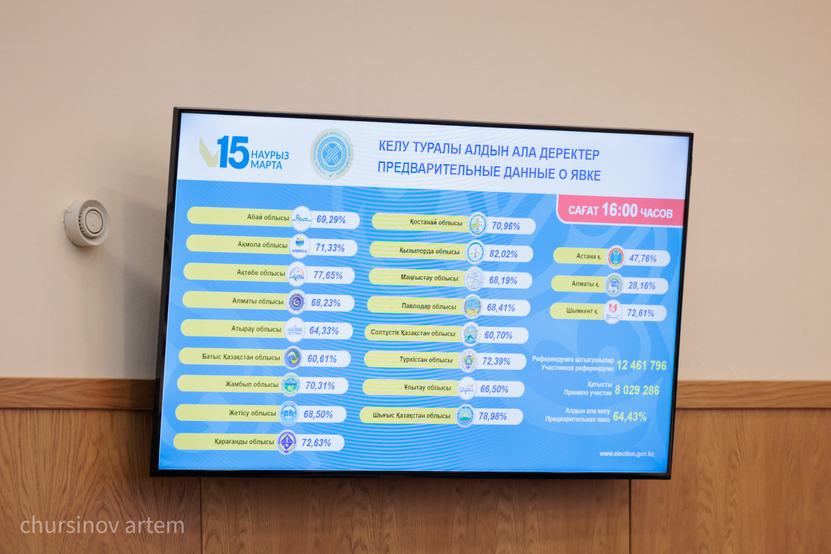 Орталық референдум комиссиясының мүшесі Әсел Жанәбілова 16:00-дегі ақпарат бойынша референдумға келушілерге қатысты ақпаратты жариялады, деп хабарлайды BAQ.KZ тілшісі.