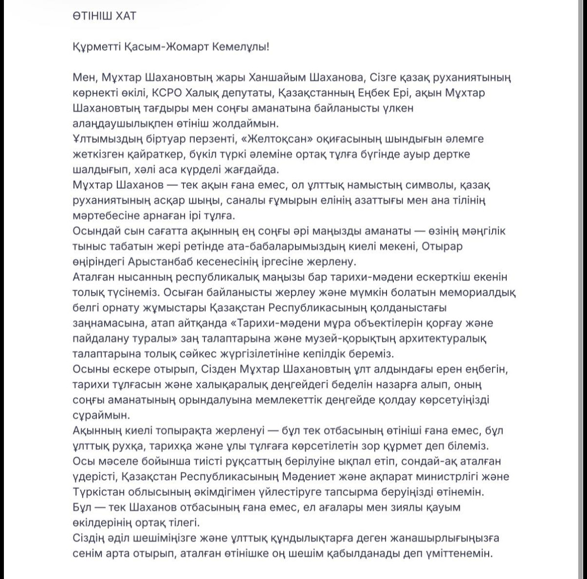 Ақынның соңғы аманаты жазылған хат 15 сәуір күні Е-Өтінішке тіркеліп, «ҚР Президент Әкімшілігіне» жолданыпты.