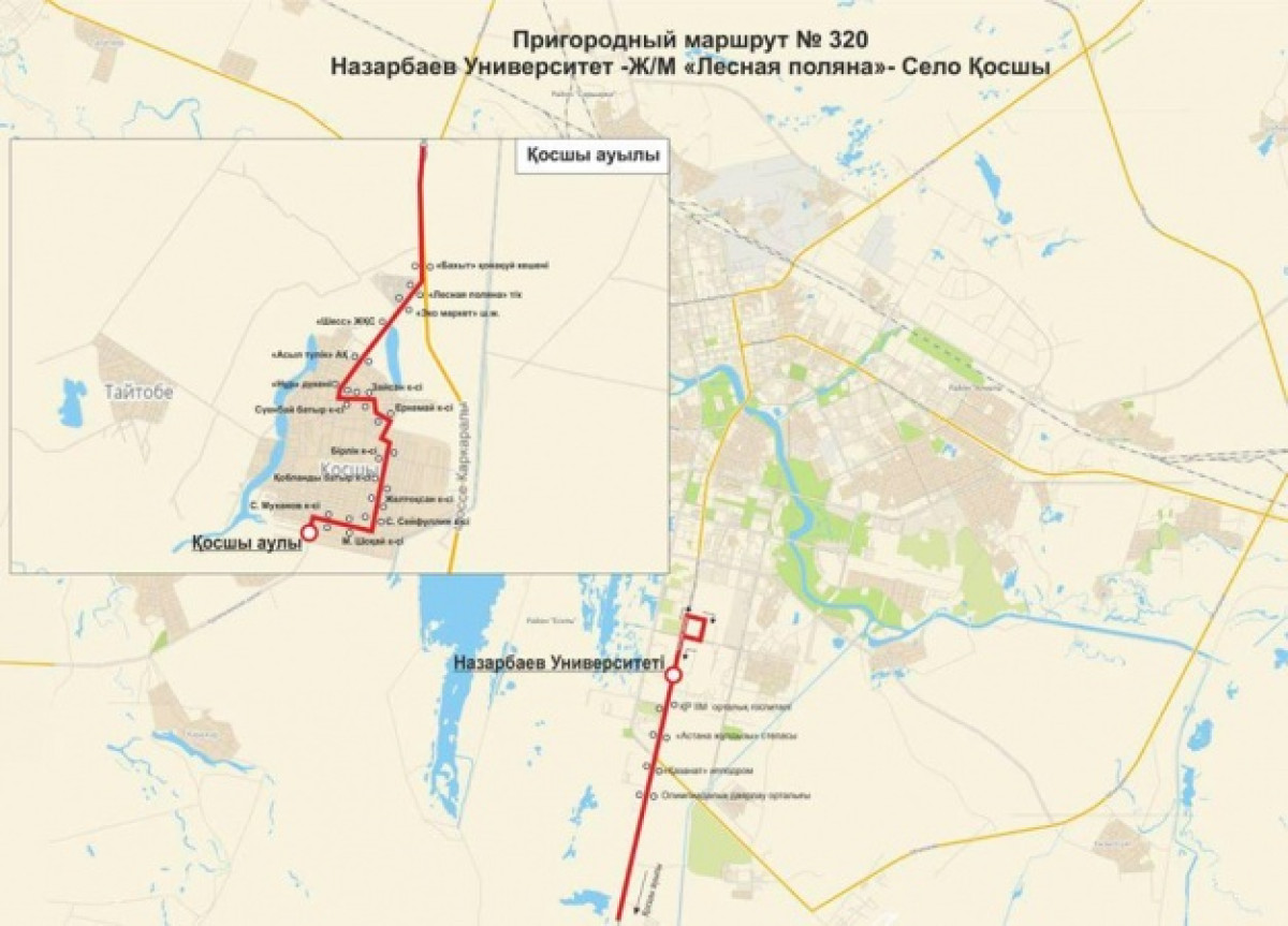 «Жаңа № 320 автобустың бағдары «Назарбаев Университеті» аялдамасынан, Қабанбай батыр даңғылымен Лесная поляна тұрғын үй алабына дейін, одан әрі Республика көшесімен Сүйінбай көшесіне дейін, сосын Қосшы ауылының сол жағымен «Муслим» дүкен-кафесіне дейін жүреді. Кері бағытта №320 бағдар жоғарыда көрсетілген сызбамен қатынайды», - делінген фейсбуктегі парақшасында.
