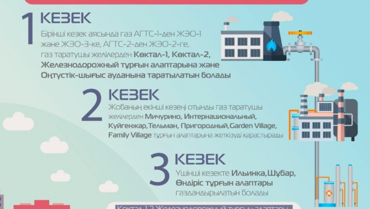 «Қаланы газбен жабтықтау үш кезеңге бөлінген. Бірінші бөлікте газ беру АГРС-1, ЖЭО-1 және ЖЭО-3 (су жылытқыш қазандар және мазут қазандары), су жылытқыш қазандар АГТС-2 және ТЭЦ-2 (2-ші ӨК) жүзеге асырылатын болады. Сондай-ақ, Көктал-1, Көктал-2 (3-6-е ПК) тұрғын алабтары, шағын аудандар, оның ішінде Железнодорожный тұрғын алабы, Оңтүстік-шығыс шағын ауданы (8-9-е ПК) бар», - деп хабарлады Астана қаласының отын-энергетикалық кешені мен коммуналдық шаруашылық басқармасы.
