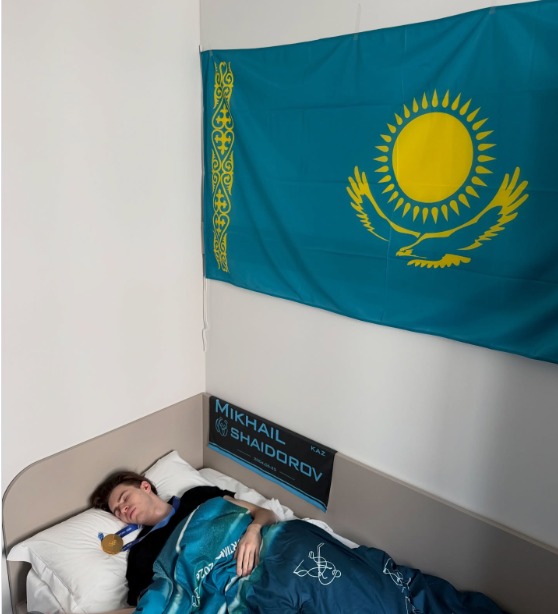 Фотосуретте Қазақстан туы ілінген бөлмеде алтын медаль таққан чемпионның ұйықтап жатқан сәті түсірілген.