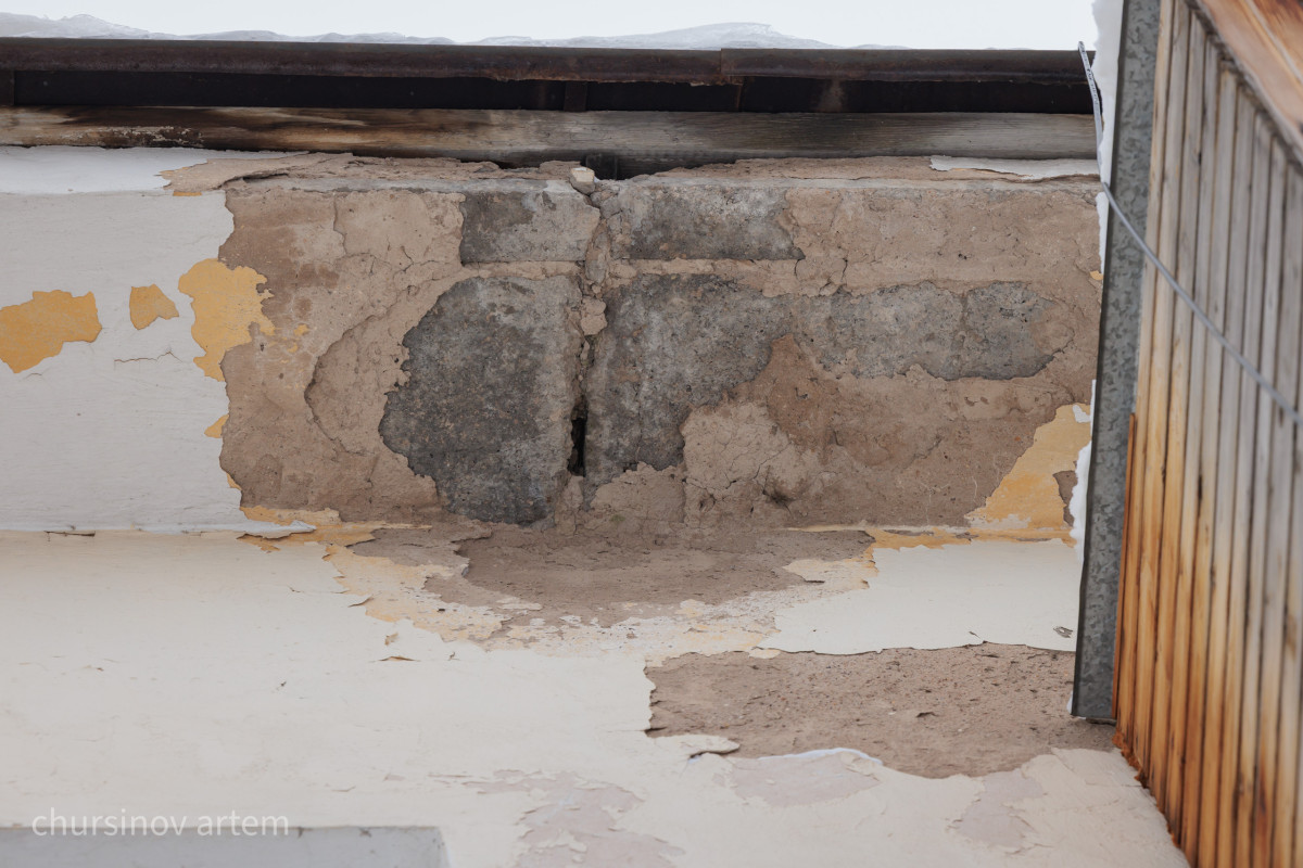 50 жылдан астам уақыт ішінде ғимарат әбден тозған. Сыртқы жағынан, шатырдың астынан плиталар арасындағы үлкен саңылаулар көрініп тұр.