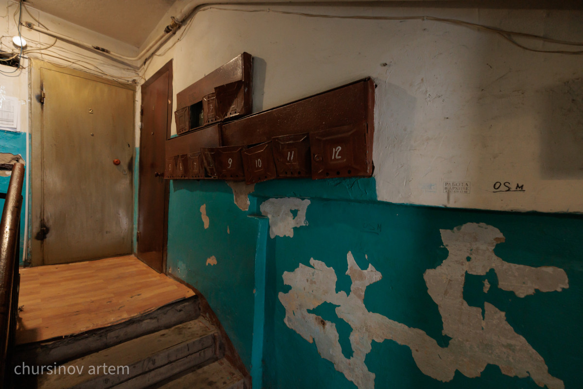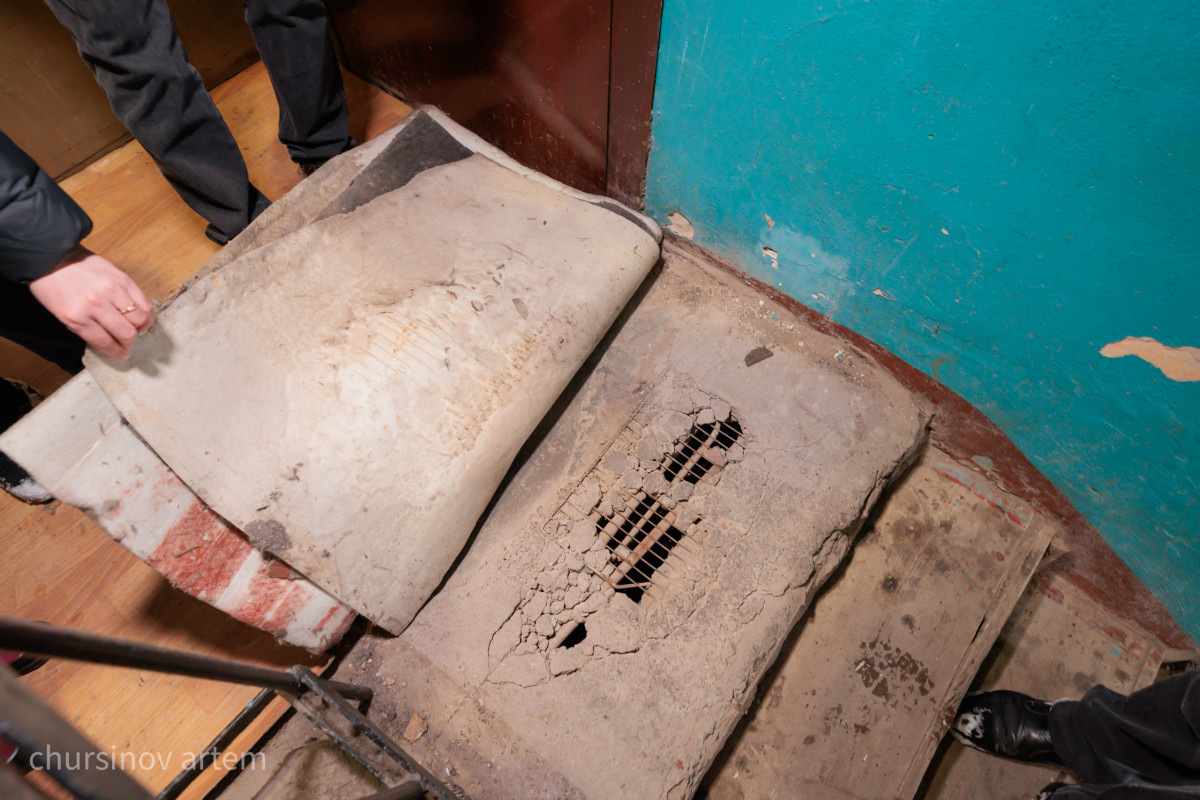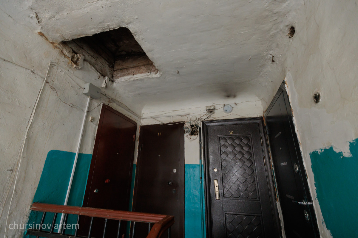 Тұрғындар баспалдақ аралықтарын құлап кетпеу үшін қосымша темір элементтермен нығайтқан. Ал кіреберіс плиталарындағы тесіктерді линолеуммен жауып қоюға мәжбүр. Сол жерден кіреберіске кәріз жүйесінің иісі мен буы тарайды.