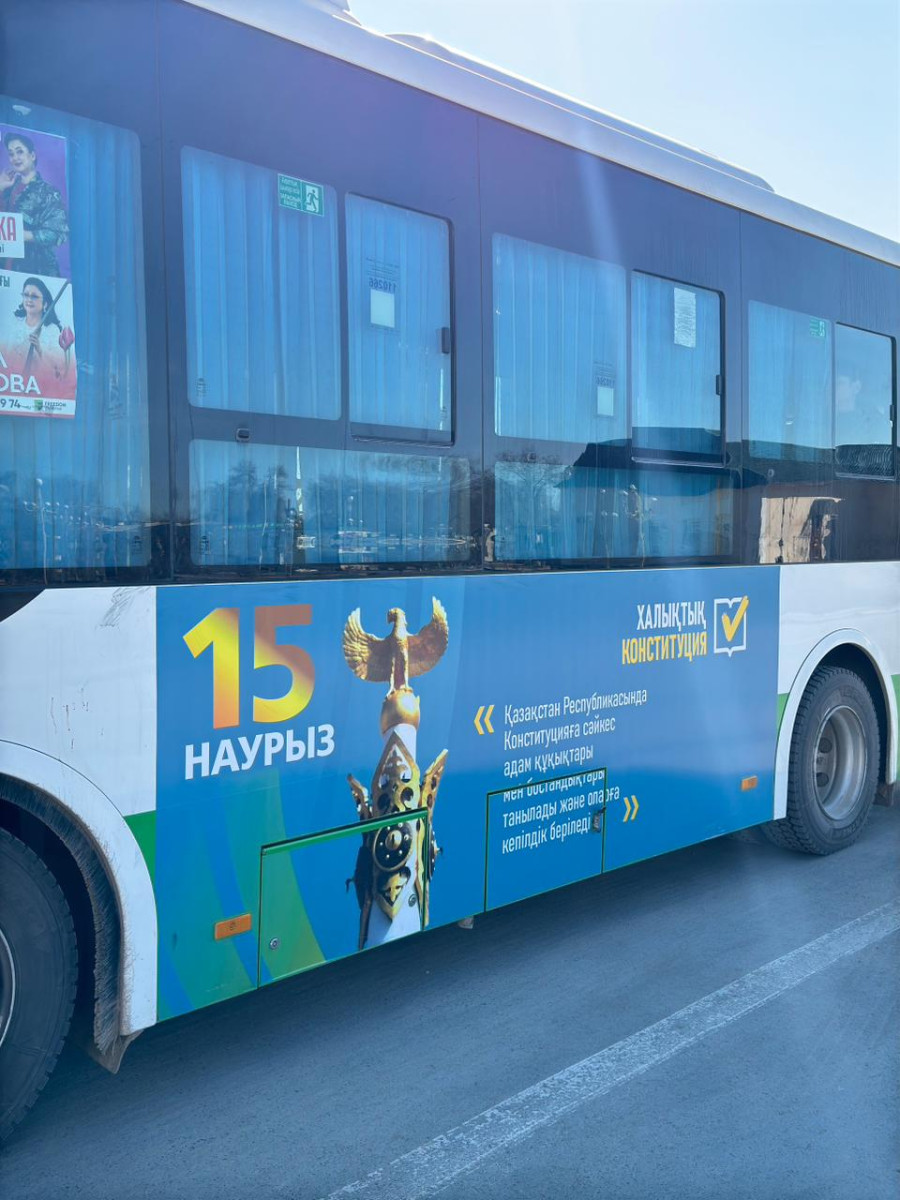 Еліміздің барлық өңірінде республикалық референдум қарсаңында ауқымды ақпараттық науқан жалғасуда. Қазіргі сәте қалалар мен облыс орталықтарында қатынайтын автобустар және басқа да қоғамдық көліктер негізгі арналардың біріне айналды, деп хабарлайды BAQ.KZ.