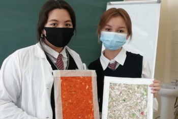 Солтүстік Қазақстан, BAQ.KZ тілшісі. Назарбаев зияткерлік мектебінің оқушылары Аида Тегумбаева мен Аружан Мәмбетова пайдаланылған тетрақапшықтарды қайта өңдеу бойынша инновациялық жоба ұсынып отыр.