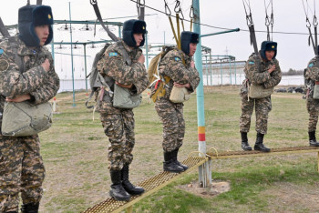 Қонаев гарнизоны 32363 әскери бөлімінің мерзімді қызмет сарбаздары парашютпен секіру элементтерін үйренуде. Бұл әуе-десанттық дайындықтың аса күрделі әрі жауапты кезеңдерінің бірі.
