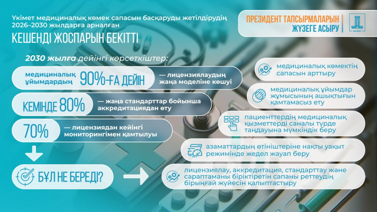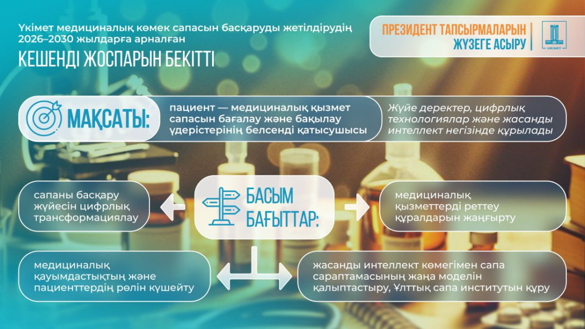 Қазақстан Республикасының Үкіметі 2026-2030 жылдарға арналған медициналық көмектің сапасын басқаруды жетілдіру жөніндегі кешенді жоспарды бекітті. Тиісті қаулыға Премьер-министр Олжас Бектенов қол қойды, деп хабарлайды BAQ.KZ.