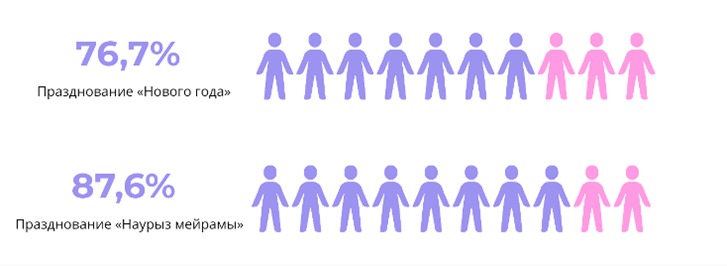 Көрсеткіштер Наурыз мерекесінің елдің барлық өңірлерінде кеңінен таралғанын айқын көрсетеді: мерекені атап өту үлесі 63,3%-дан 100%-ға дейін өзгереді. Бұл оның әмбебап әрі біріктіруші сипатқа ие екенін айғақтайды, - делінген зерттеуде.